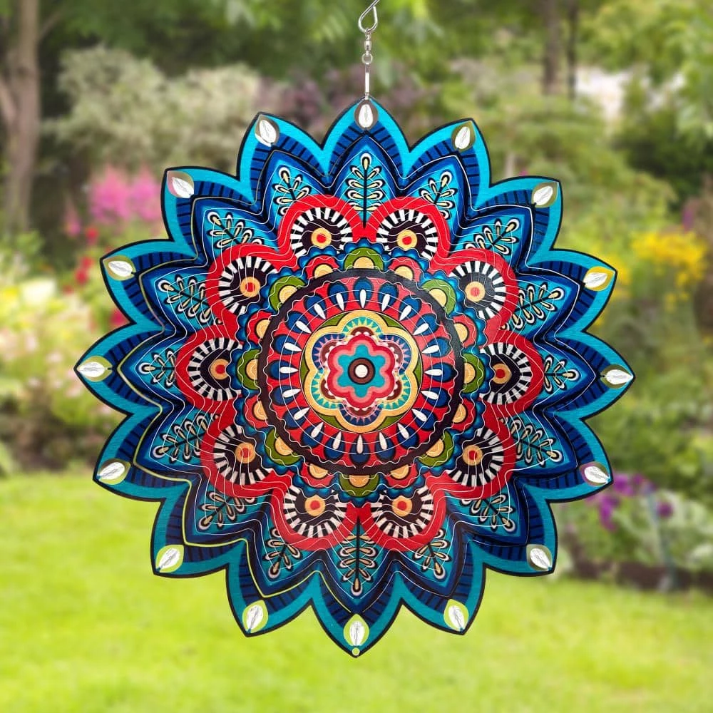 A 3D burst of colors come alive with this beautiful blue and red spinning laser cut hanging garden spinner. Easily fans out to display intricate details and beaded accents that shine in the light. This ready-to-hang garden art makes a wonderful addition to your home and a treasured gift for your loved one.