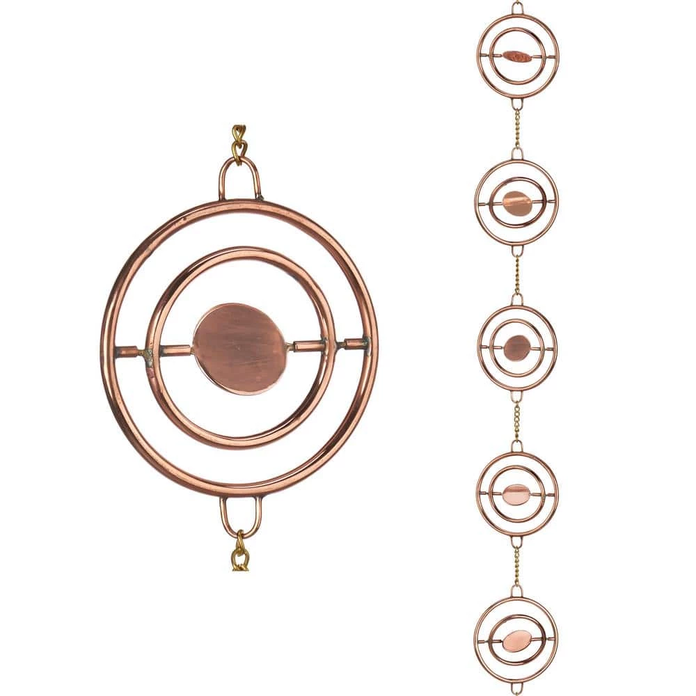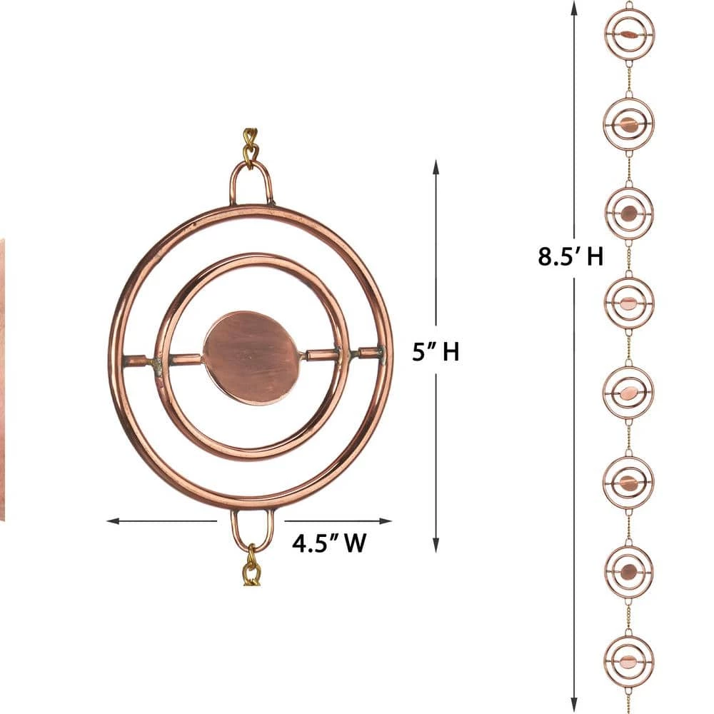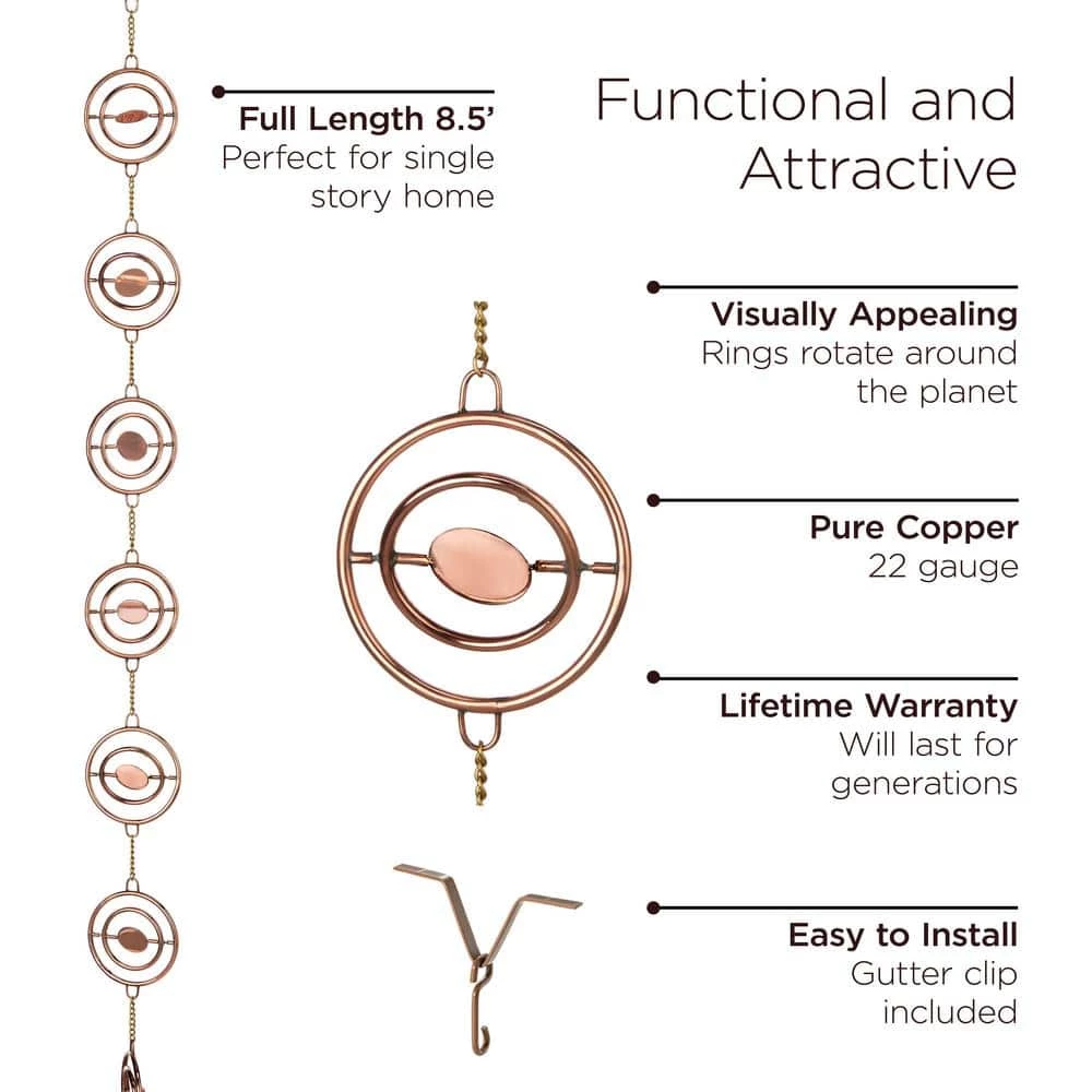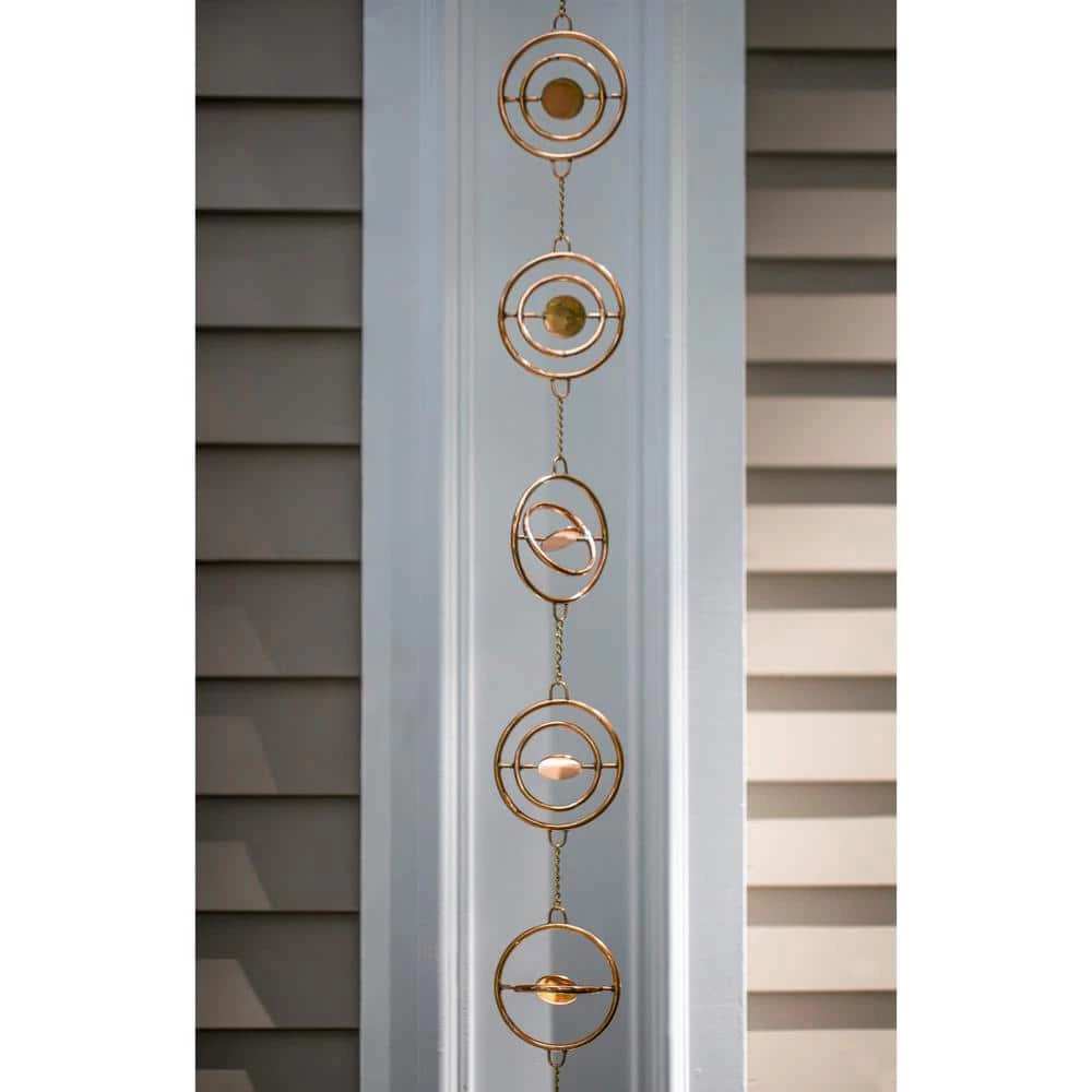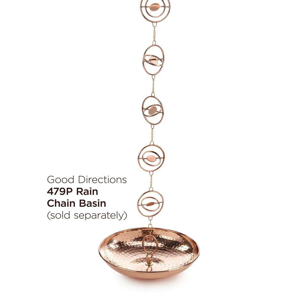 The Stellar Rain Chain from Good Directions is artistically-designed and handmade using pure copper to create a rain chain that is both beautiful and functional. Thirteen, rotating, 4.5 in. stellar rings link together with brass chain to create an 8.5-ft. rain chain that allows water to cascade beautifully from rooftop to ground. Each orbiting ring is carefully crafted to revolve as water travels down. For easy installation a gutter clip is included. You will welcome rain when you replace your ordinary gutter downspout with the Stellar Rain Chain. Our rain chains are built to last and are backed by an industry-exclusive Lifetime Warranty to ensure your satisfaction. For over 38 years, Good Directions has been handcrafting pure copper works of art to enhance the homes of house-proud homeowners.
